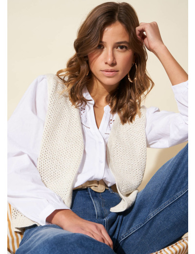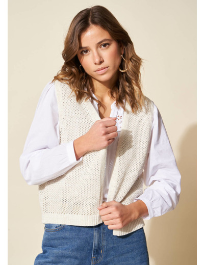Le gilet ouvert sans manches GATOULOU se distingue par sa coupe contemporaine et son élégance accentuée par l'utilisation de fibres métallisées. Il viendra en superposition perfectionner toutes vos tenues.