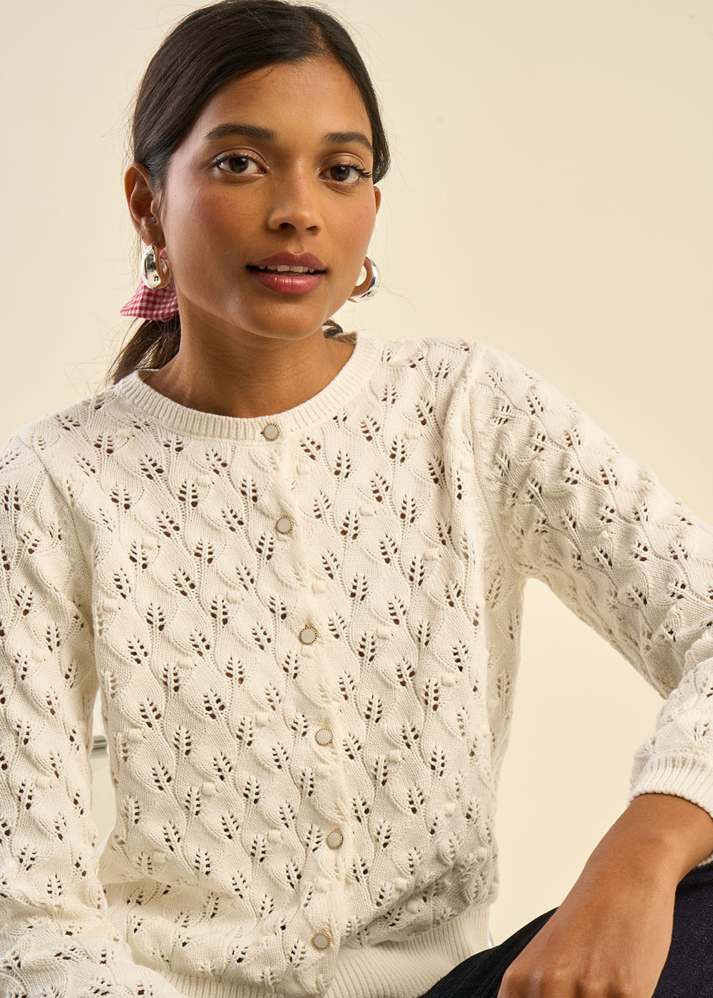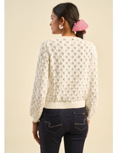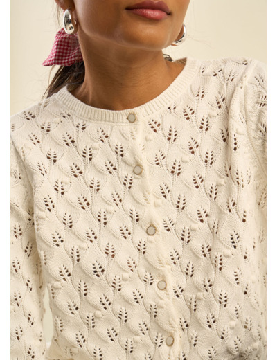 Le gilet GARYA, en 100% coton, séduit par son tricot ajouré délicat et sa coupe courte, idéale pour structurer une tenue. Doté d’un col rond intemporel et de manches longues, il offre un style féminin et raffiné. Ses finitions en bords-côtes ajoutent une touche de confort et d’élégance. Portez-le par-dessus une robe fluide pour un look romantique ou associez-le à un jean taille haute et un top ajusté pour une allure moderne et casual.