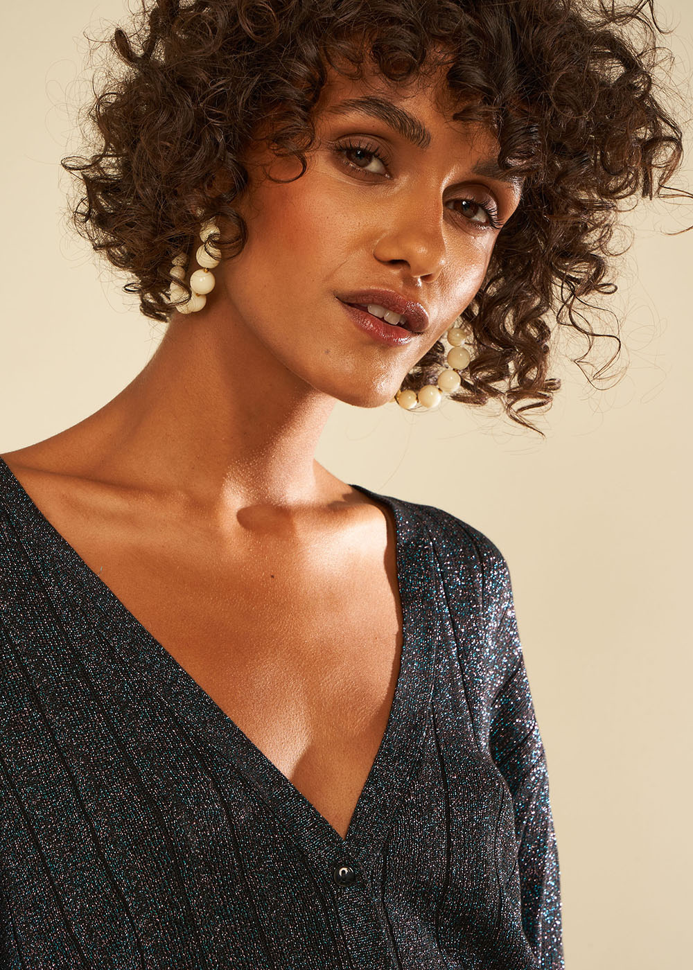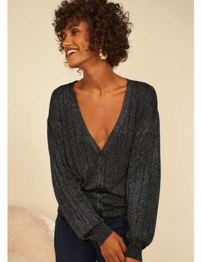 Ce gilet GLAMY à col en V est un choix polyvalent pour différentes occasions. Que ce soit pour ajouter une couche de style à une tenue décontractée ou pour une soirée spéciale le mélange de côtes plates et de lurex en fait une pièce qui attire l'attention tout en restant subtilement sophistiquée.