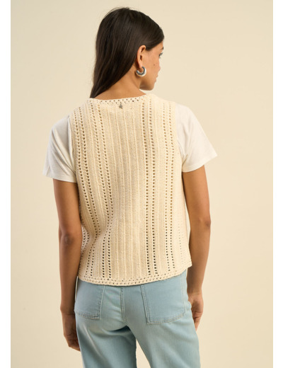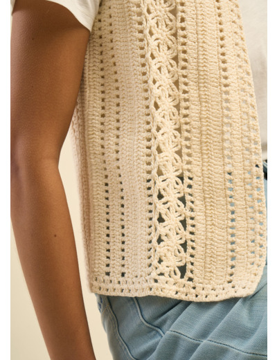 Laissez-vous séduire par notre gilet GARYOU, une pièce sans manches au charme intemporel. Son tricot en maille crochet de moyenne jauge lui apporte une texture authentique et raffinée, idéale pour une allure bohème et élégante.