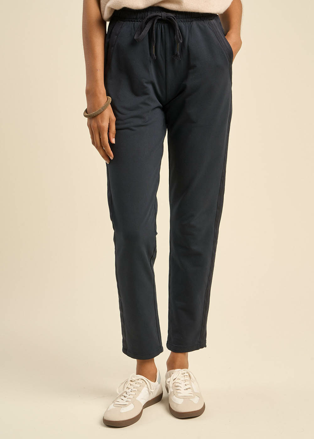 Le jogging POERY présente une taille élastiquée avec un cordon de serrage pour un ajustement confortable. Il dispose de poches italiennes à l'avant agrémentées de biais en satin ton sur ton le long de la jambe. Associez-le à un tee-shirt blanc pour créer un ensemble à la fois élégant et décontracté.