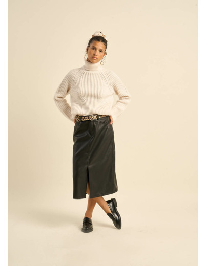 La jupe JULINE, un jeu de contrastes. Sa coupe mi-longue, associée au faux cuir, lui confère une allure rock chic. Les découpes devant et dos, soulignées par des surpiqûres audacieuses, apportent une touche d'originalité. Disponible en noir intemporel ou en chocolat plus doux, elle s'adapte à toutes les personnalités.