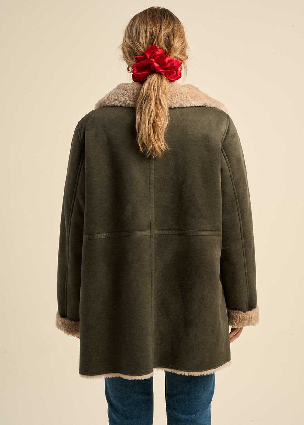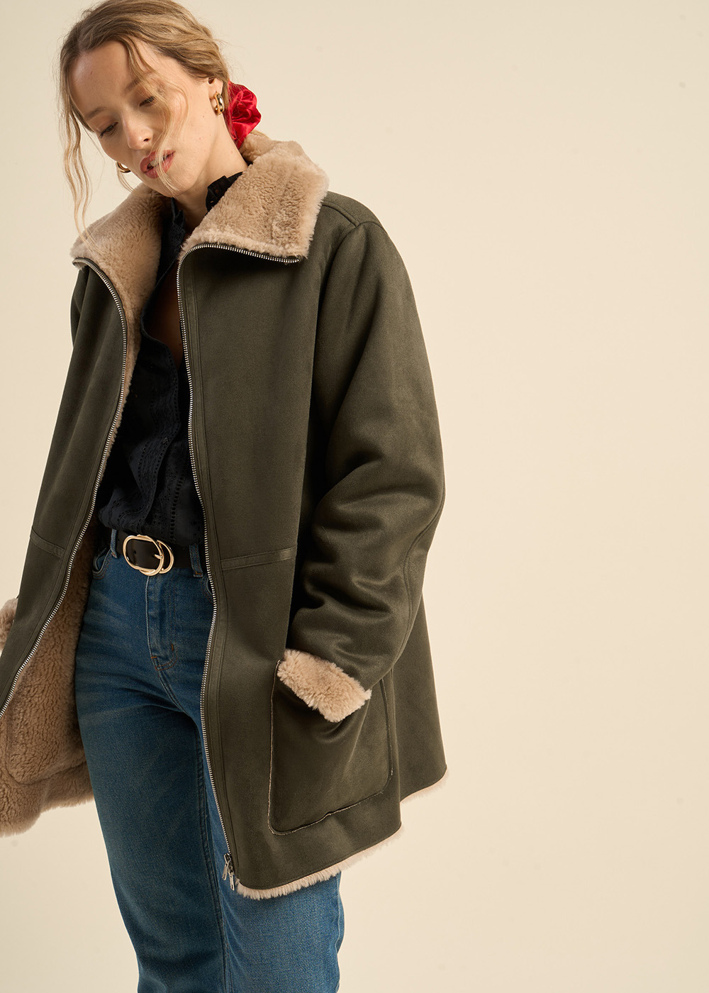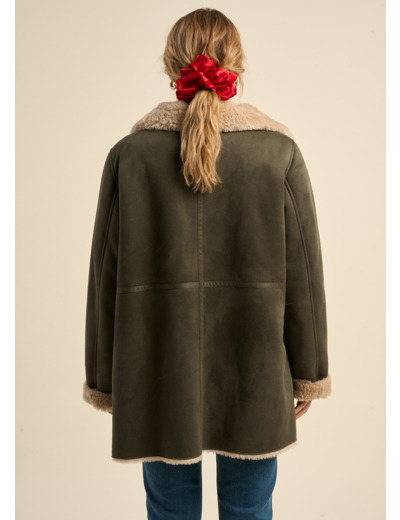 Le manteau MYAN en fausse peau lainée combine confort et élégance. Il se distingue par sa fermeture à zip au milieu devant, offrant un accès facile et une touche moderne. Les deux poches plaquées à l'avant ajoutent une fonctionnalité pratique, tandis que les revers en fausse fourrure aux poignets apportent une note de luxe et de chaleur.