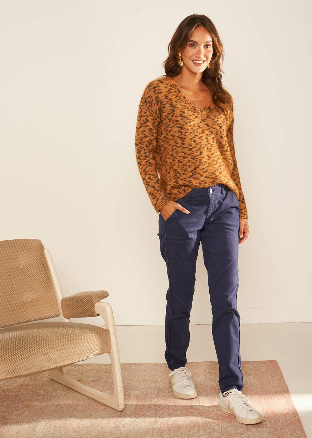 Le pantalon PIRMA adopte une coupe chino. Il adopte une coupe medium et des bandes fantaisies en lurex le long des jambes. Portez-le avec un pull en maille coloré.