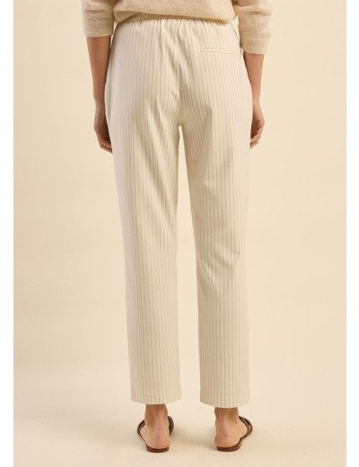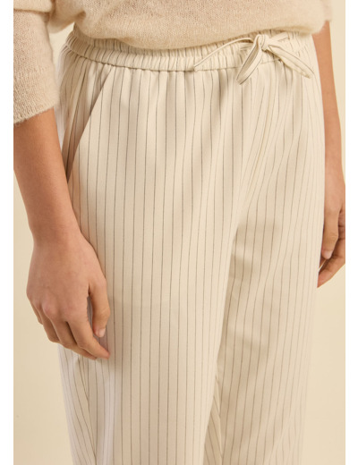 Le pantalon PLESOL allie confort et élégance avec sa taille élastique dotée d’un cordon ajustable. Confectionné dans un tissu fluide, il offre une coupe droite qui épouse parfaitement la silhouette tout en restant agréable à porter. Ses poches italiennes ajoutent une touche pratique et chic. Le fond écru à fines rayures marron apporte une note subtile et raffinée à ce pantalon, idéal pour un look élégant et intemporel. Facile à associer avec une blouse ou un top, il vous accompagne aussi bien au quotidien qu'en soirée.