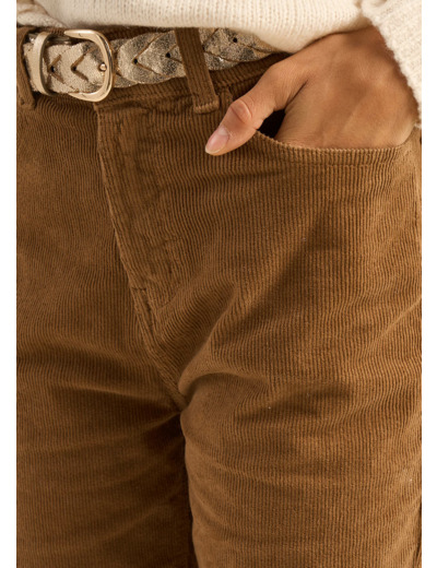 Le pantalon PALOMA, une réinterprétation moderne du pantalon en velours. Sa coupe droite et large, associée à la texture du velours côtelé 11 raies, lui confère un charme intemporel. La taille haute souligne la silhouette et les poches plaquées apportent une touche pratique.