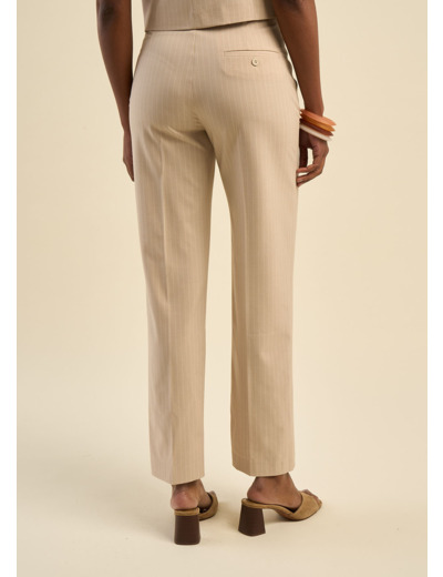 Le pantalon PILLY, l’allié parfait de la femme moderne. Avec sa coupe large et sa taille haute, il allonge la silhouette tout en offrant un confort optimal. Ses poches italiennes et sa poche passepoilée au dos ajoutent une touche d’élégance et de praticité. Son tissu à fines rayures écrues sur fond beige apporte une note subtile et raffinée. Associez-le à la veste VARIA ou au gilet GARIA pour un look urbain et sophistiqué.