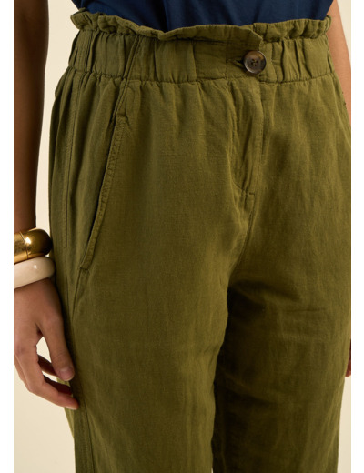Le pantalon PAOLINE avec sa coupe slouchy et sa taille haute élastiquée est conçu avec un mélange de lin et de coton pour une sensation de confort et de légèreté. Associez-le à un tee-shirt en lin et des baskets blanches pour un style confortable au quotidien.