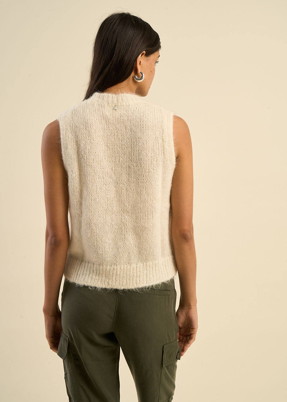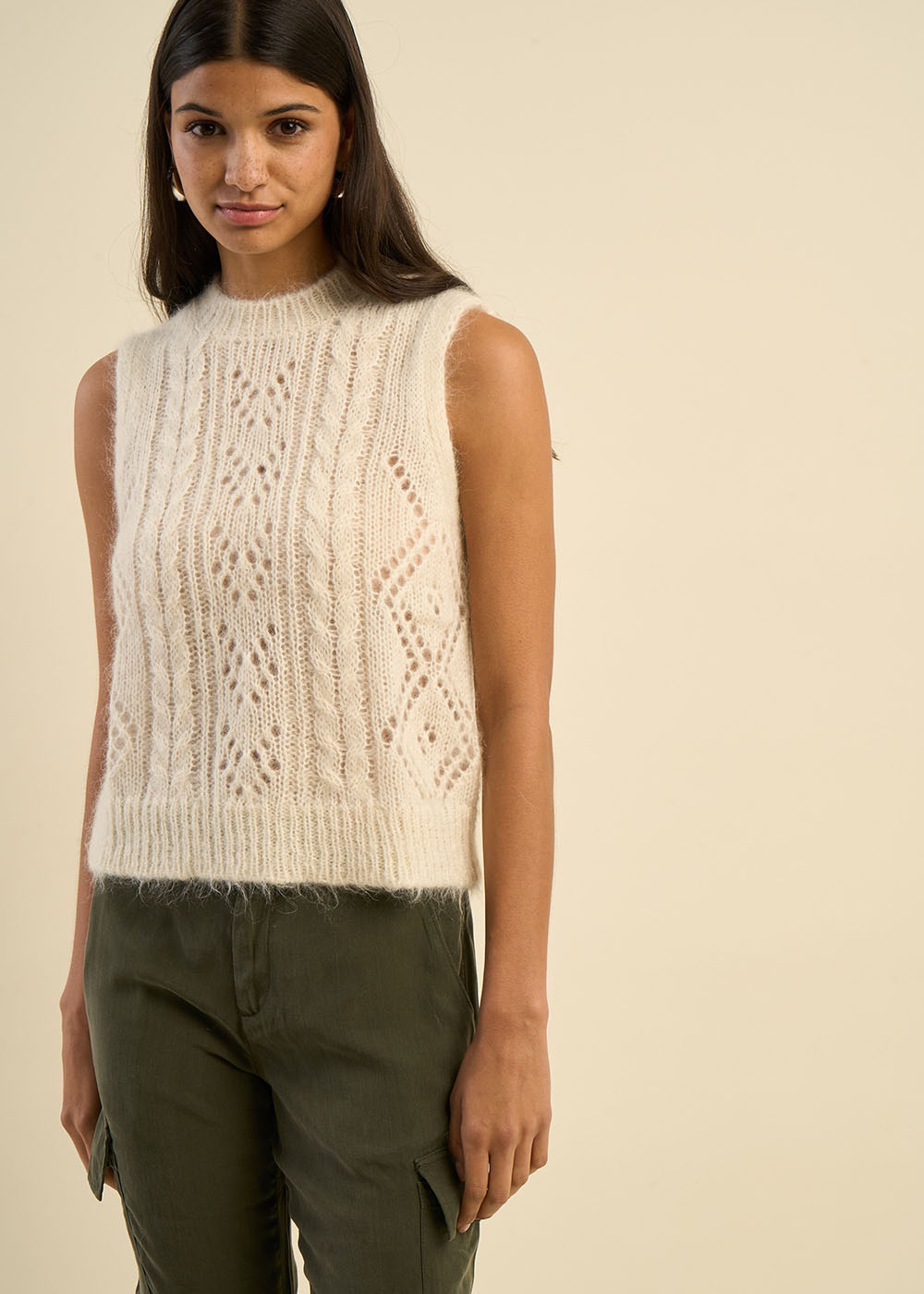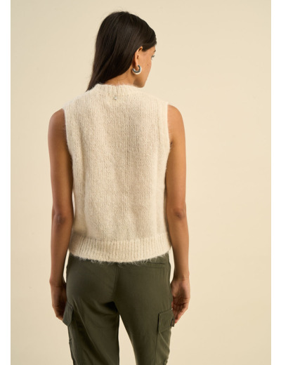 Le pull sans manches MEDUSA est une pièce intemporelle qui allie douceur et sophistication. Confectionné dans un mélange noble de mohair et d'alpaga, il se distingue par son tricot torsadé enrichi de détails ajourés, apportant une subtile touche de féminité. Son encolure ronde et ses bords côtes au col, à la base et sur les emmanchures assurent une finition élégante et soignée. Parfait pour être porté en superposition sur une chemise ou un haut texturé, ce pull offre une allure moderne et chic.