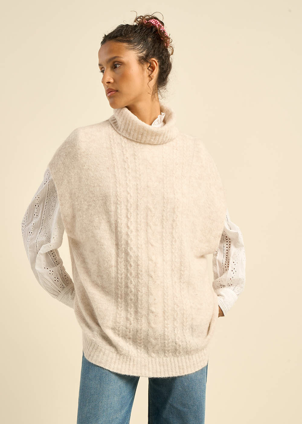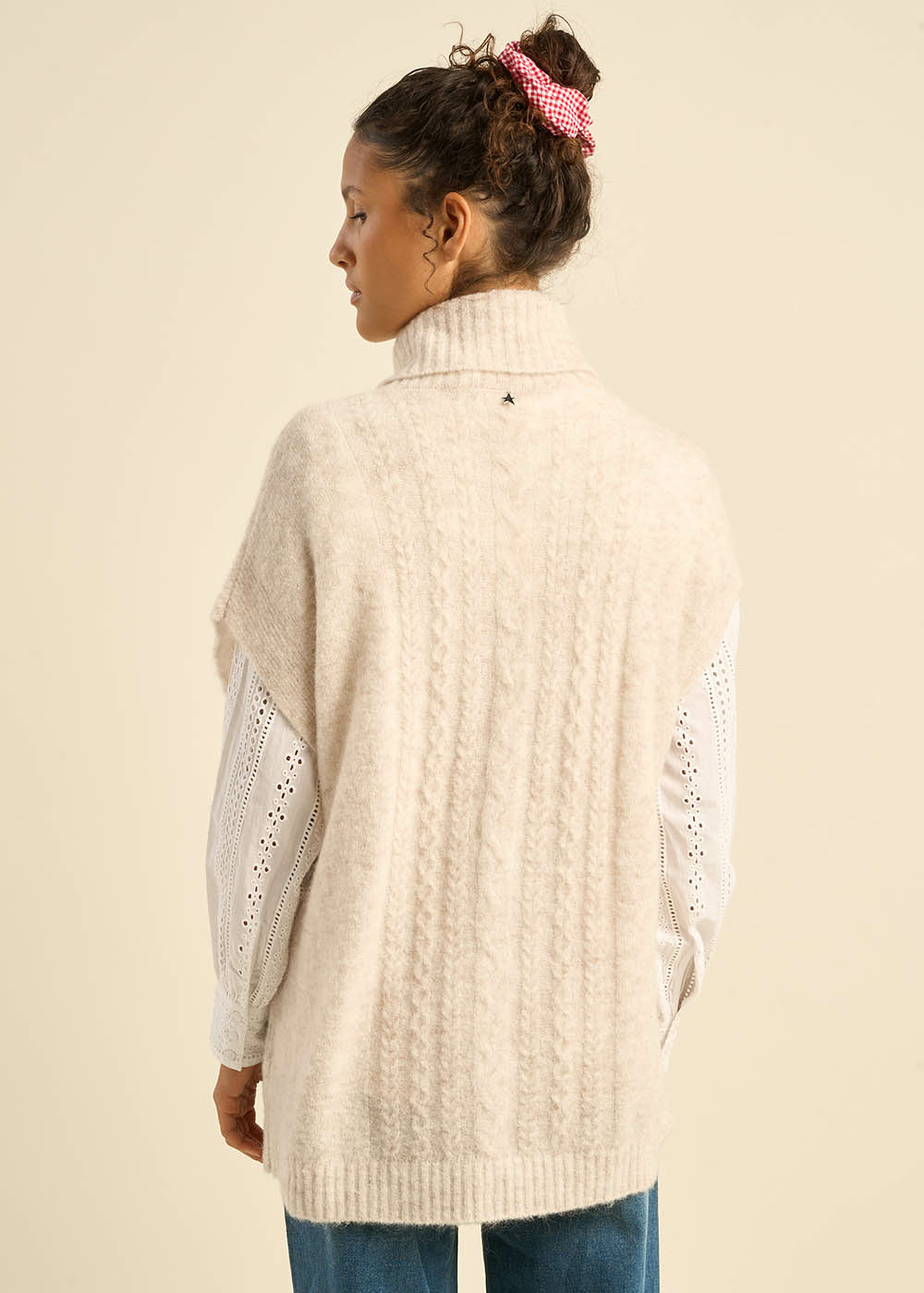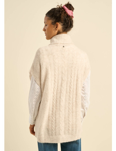 MISHAPIA, le pull sans manches qui allie confort et élégance. Son col roulé enveloppant et sa forme ample en font une pièce intemporelle. Les jeux de torsades apportent une touche d'originalité à ce modèle doux et chaleureux. Parfait à porter par-dessus une chemise blanche et avec un pantalon en velours pour un look cosy et chic.