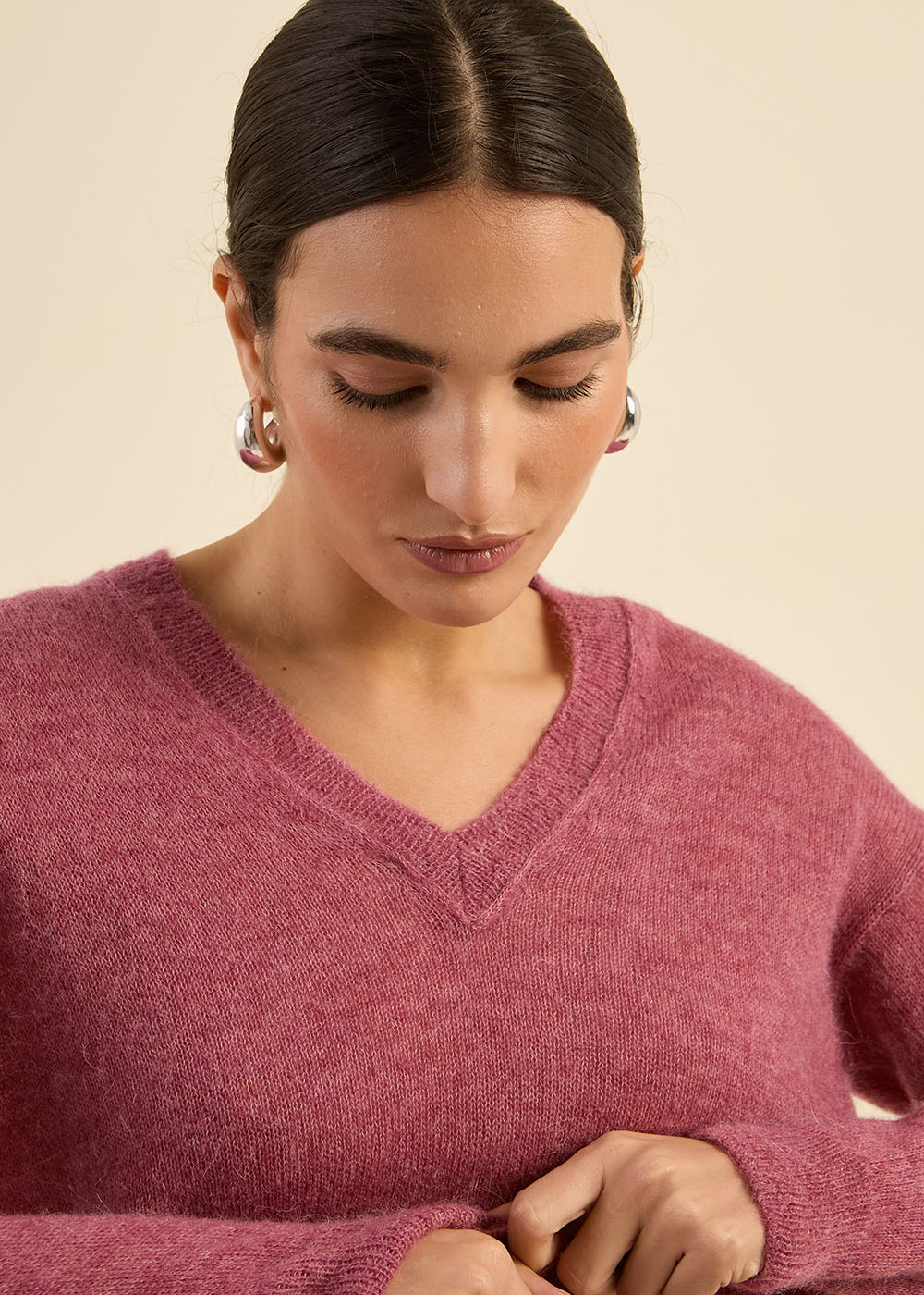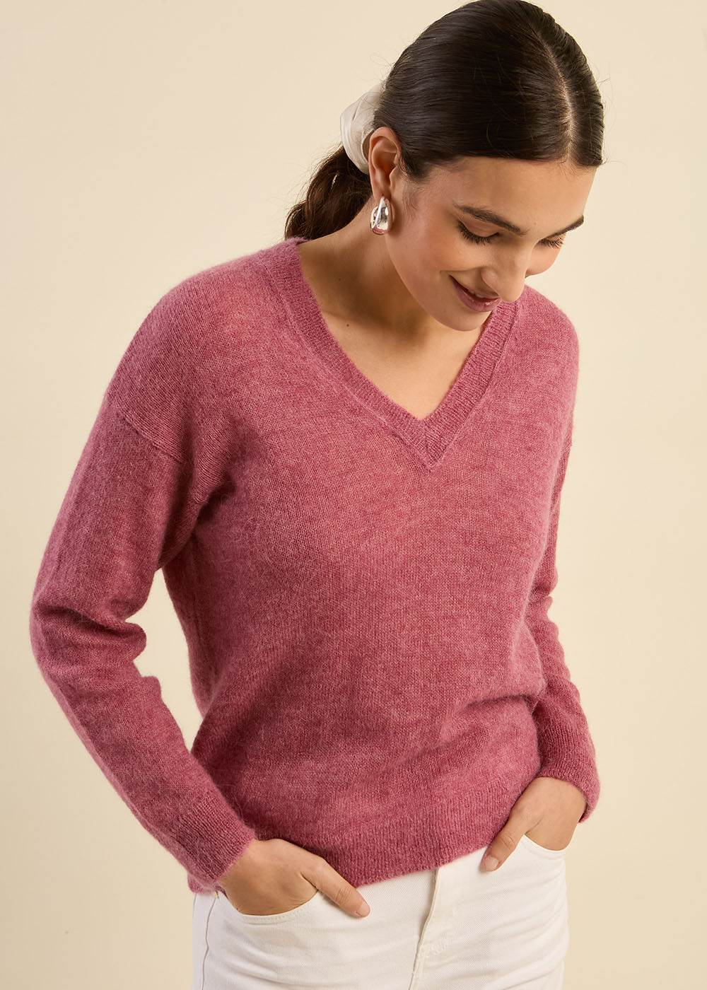 Le pull MARTINY est conçu pour offrir un mélange parfait de chaleur et de confort. Avec son col en V, ses épaules tombantes et sa forme ample, il apporte une touche de décontraction élégante à votre garde-robe. Ce modèle en moyenne jauge, aux manches longues et à l'effet mohair, se distingue par son tricotage doux et enveloppant. Portez-le avec un pantalon de tailleur pour une allure sophistiquée ou associez-le à un jean pour un look décontracté et confortable.