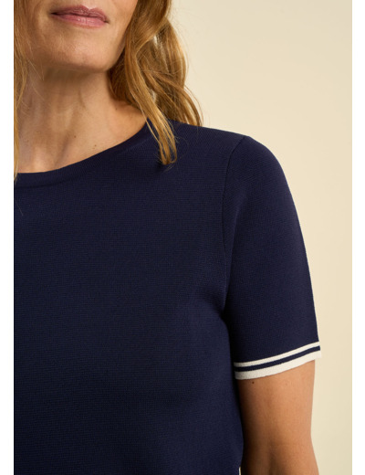 Laissez-vous charmer par notre pull MOVAK, une pièce parfaite pour les journées plus douces. Ce modèle à manches courtes, près du corps, présente un col rond classique et une coupe moderne qui souligne la silhouette. Les détails de rayures discrètes ajoutent une touche sportive inspirée du style tennis, tandis que la texture du tricot offre à la fois confort et élégance.