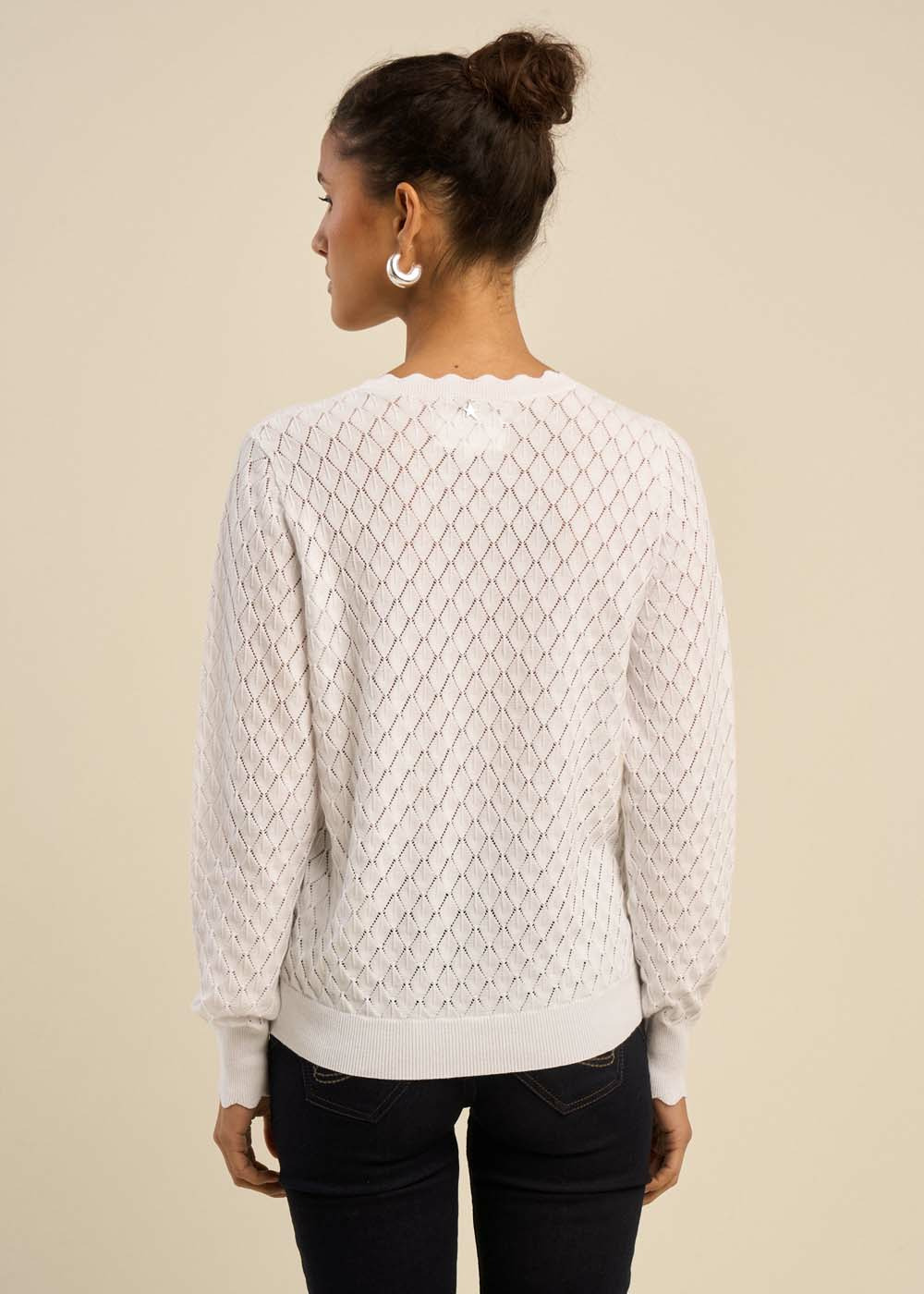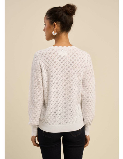 Ce pull se distingue par ses détails délicats et raffinés, tels que les bords festonnés qui ornent subtilement le col rond et les manches longues.