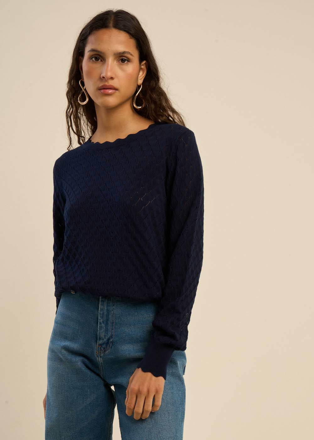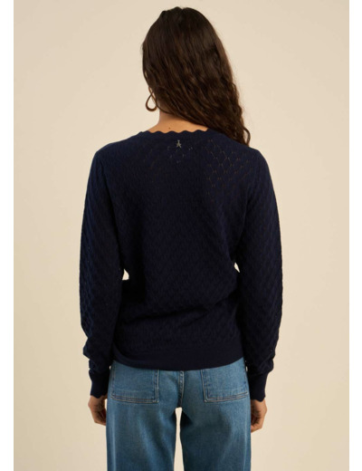 Ce pull se distingue par ses détails délicats et raffinés, tels que les bords festonnés qui ornent subtilement le col rond et les manches longues.