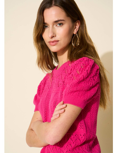 Le pull MADALOU à manches courtes est doté d'un col rond. Confectionné en coton doux il offre un confort exceptionnel tandis que son tricotage fantaisie en bandeaux apporte une touche de modernité à votre tenue. Un essentiel tendance qui allie confort et élégance avec brio.