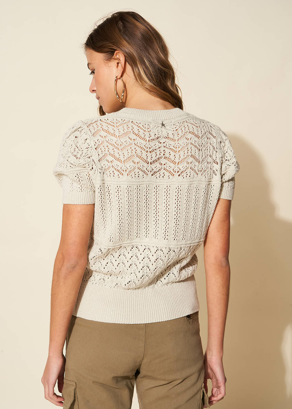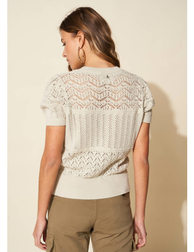 Le pull MADALOU à manches courtes est doté d'un col rond. Confectionné en coton doux il offre un confort exceptionnel tandis que son tricotage fantaisie en bandeaux apporte une touche de modernité à votre tenue. Un essentiel tendance qui allie confort et élégance avec brio.
