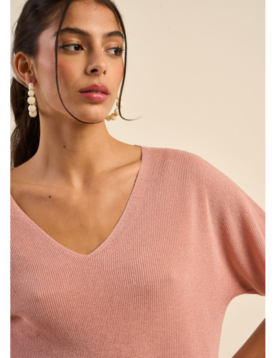 Le pull MIKOLLAYX est une pièce tendance qui allie modernité et légèreté grâce à sa coupe ample et sa matière raffinée. Confectionné en fine jauge, il séduit par son éclat subtil grâce à l'ajout de fibres métallisées. Son col V, rehaussé d’un délicat liseré en fibre métallisée, apporte une touche élégante et lumineuse. Avec ses manches courtes chauve-souris, il offre un style décontracté et chic.