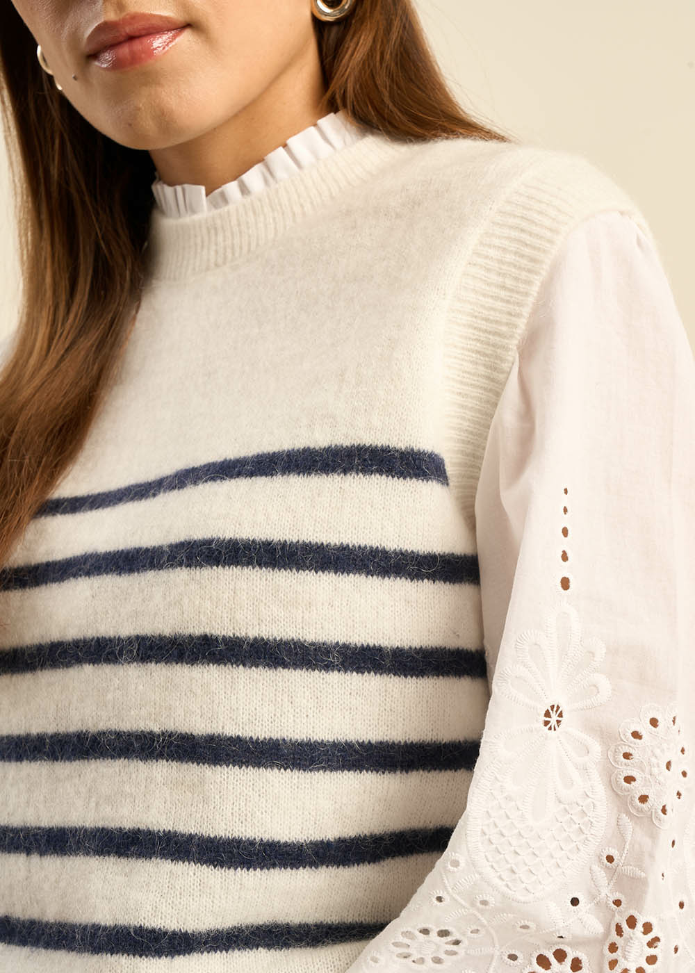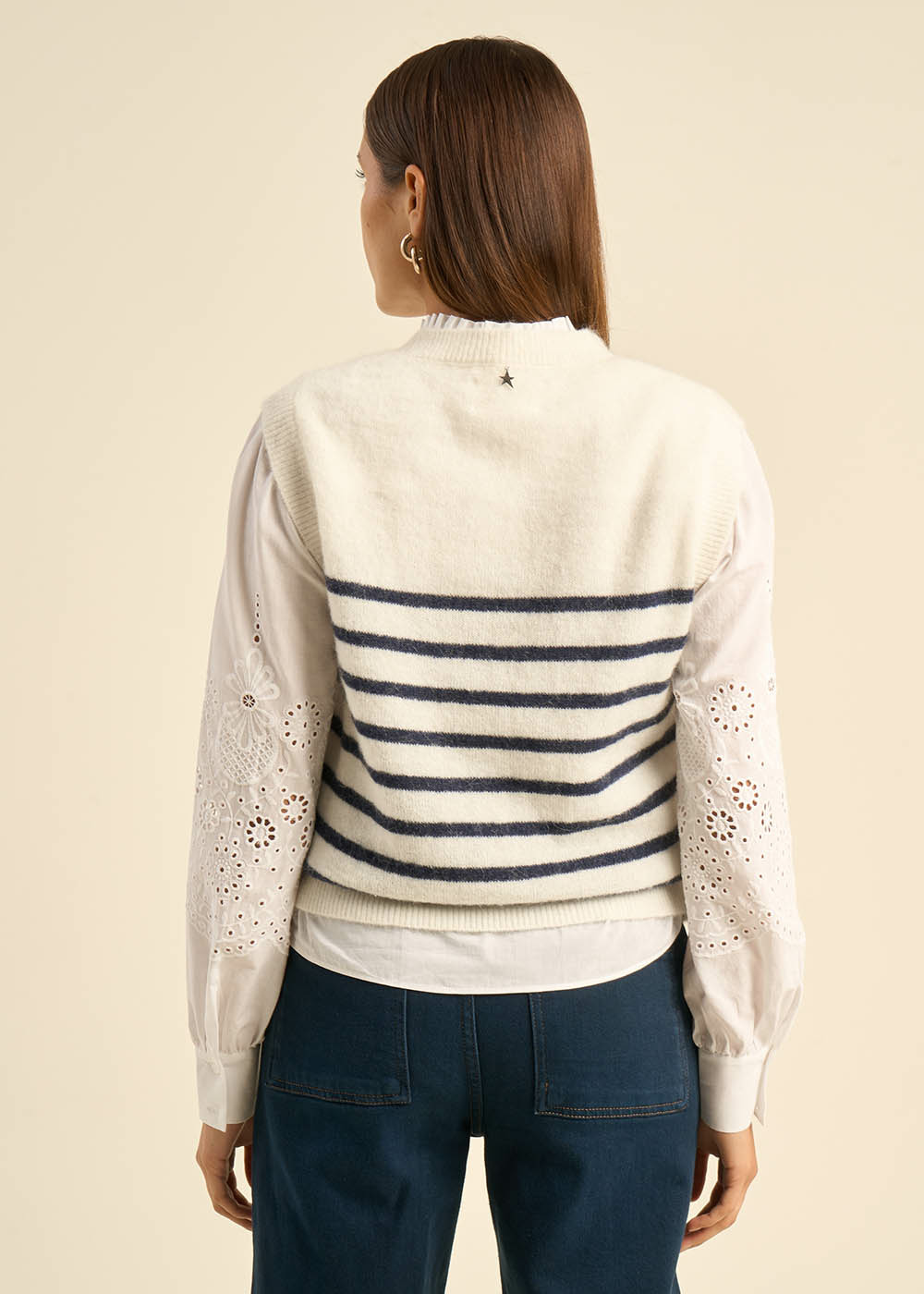 Découvrez le pull sans manches MARTO, parfait pour compléter vos tenues avec style. Il présente un col rond classique et des détails côtelés aux bordures. Orné de rayures bleues sur fond blanc, il est idéal sur une chemise pour un look chic.