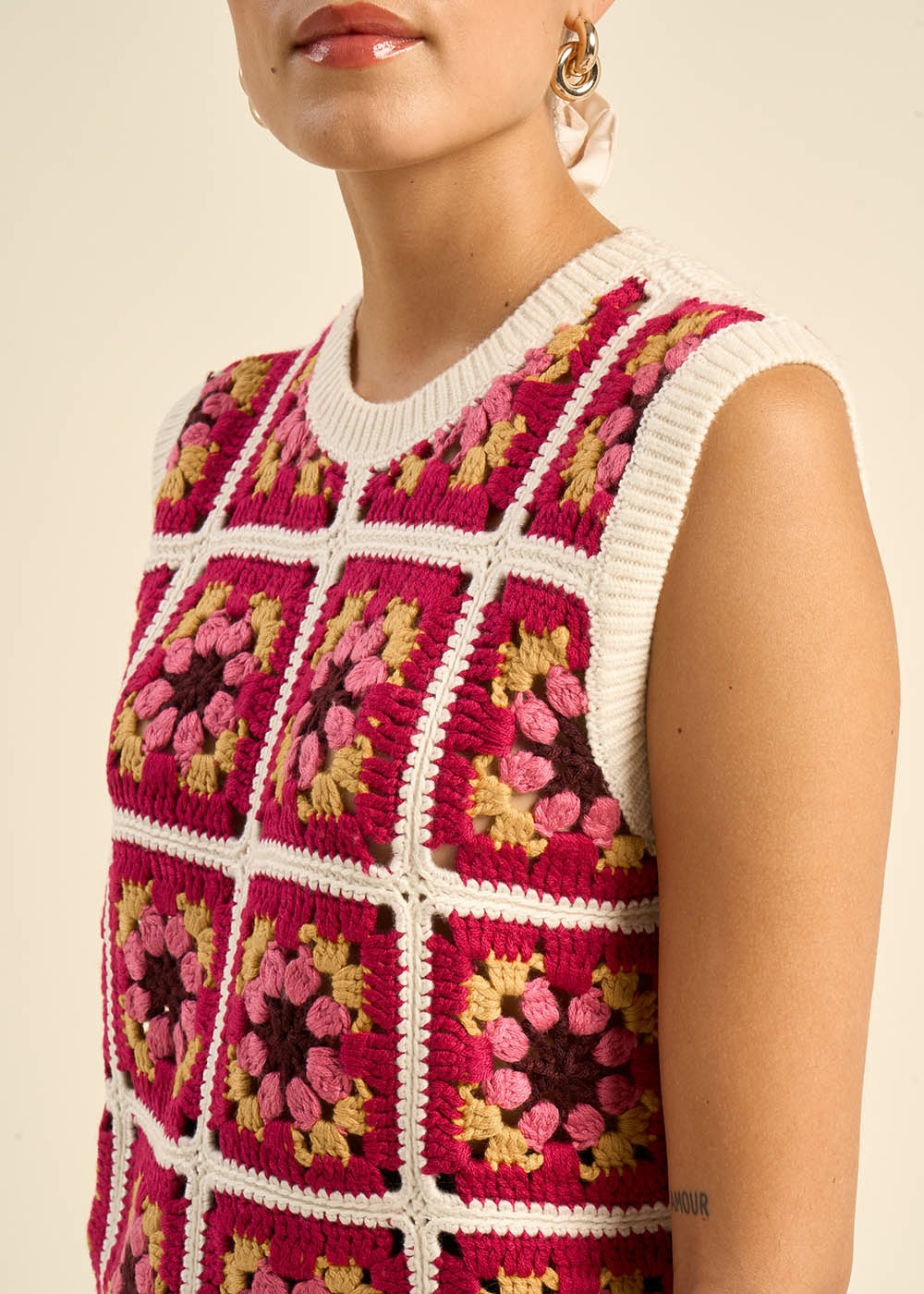 Le MARCY est le pull sans manches qui vous transportera en plein cœur de l'été. Confectionné avec des fils colorés, ce pull en crochet arbore un motif fuschia vibrant sur un fond écru. Son encolure ronde et ses bord-côtes lui confèrent une allure à la fois bohème et intemporelle. Parfait pour les journées chaudes et les soirées fraîches. Ce modèle, au style rétro et coloré, apporte une touche de gaieté à toute tenue. Sa coupe légèrement ample en fait un choix idéal pour être porté seul ou par-dessus une chemise pour un look plus habillé.