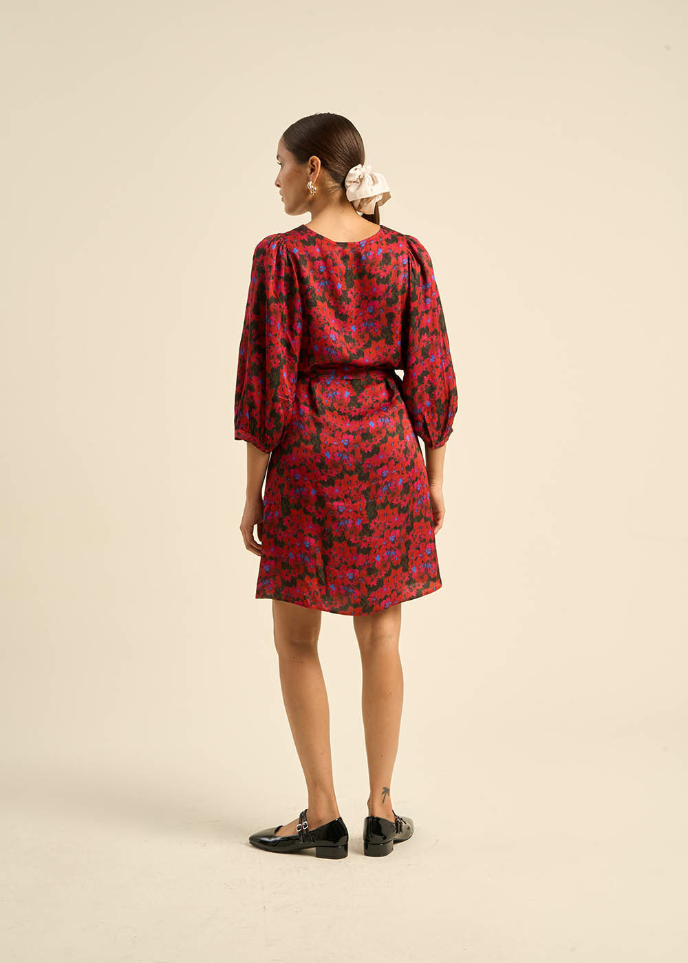 La robe courte RAMILIA en satin viscose se distingue par son imprimé floral vibrant en rouge, noir et une touche de bleu. Ses manches chauve-souris 3/4 et son encolure en V créent une silhouette fluide et élégante. À la taille, elle se ceinture avec une ceinture en tissu pour souligner votre forme. Parfaite pour ajouter une touche de glamour à vos journées comme à vos soirées.