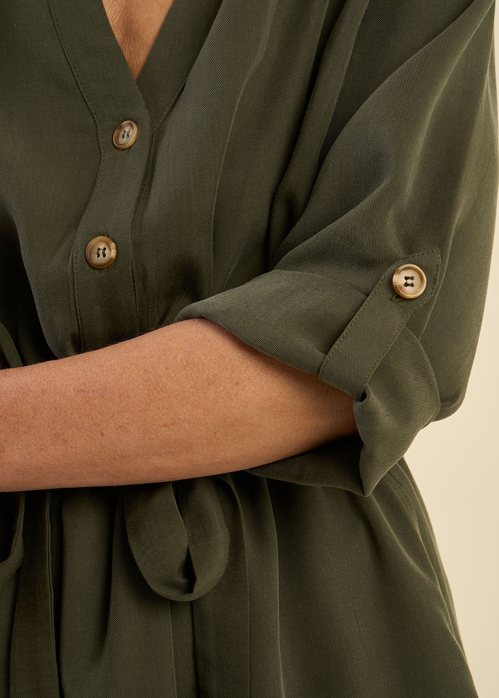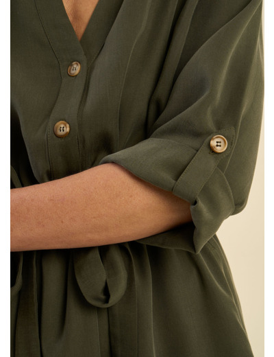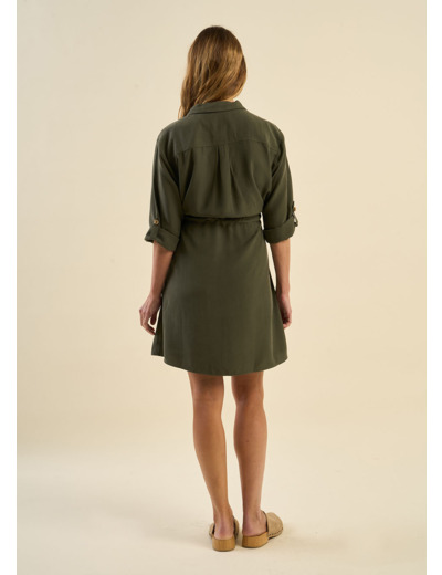 La robe Rabana est une robe courte élégante et polyvalente. Elle se distingue par ses manches 3/4 ajustables grâce à une patte, offrant la possibilité de moduler leur longueur selon vos envies. Son col chemise apporte une touche sophistiquée, tandis que la ceinture insérée à la taille, accompagnée d’un lien coulissant, permet de souligner la silhouette avec élégance. Enfin, ses poches italiennes ajoutent une fonctionnalité discrète et un détail chic à l'ensemble. Cette robe est idéale pour un look à la fois confortable et raffiné.
