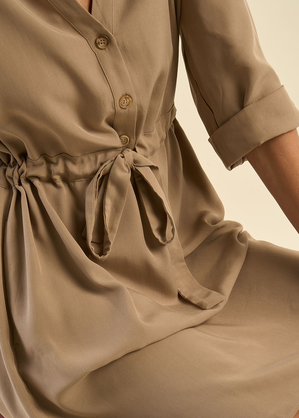 La robe Rabana est une robe courte élégante et polyvalente. Elle se distingue par ses manches 3/4 ajustables grâce à une patte, offrant la possibilité de moduler leur longueur selon vos envies. Son col chemise apporte une touche sophistiquée, tandis que la ceinture insérée à la taille, accompagnée d’un lien coulissant, permet de souligner la silhouette avec élégance. Enfin, ses poches italiennes ajoutent une fonctionnalité discrète et un détail chic à l'ensemble. Cette robe est idéale pour un look à la fois confortable et raffiné.