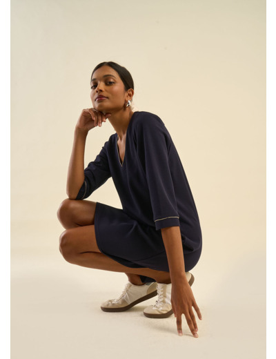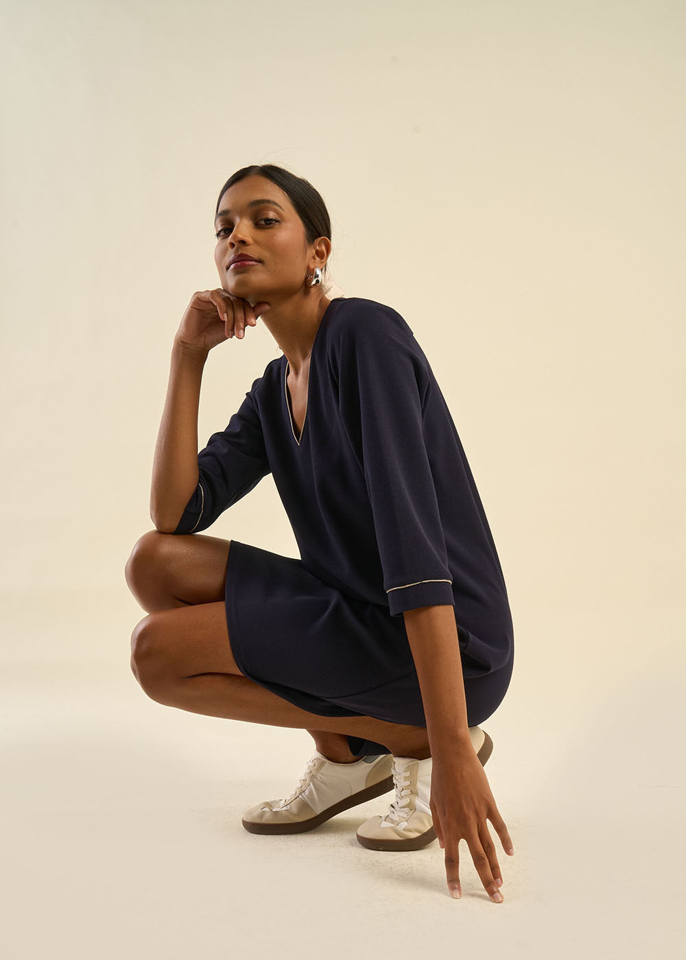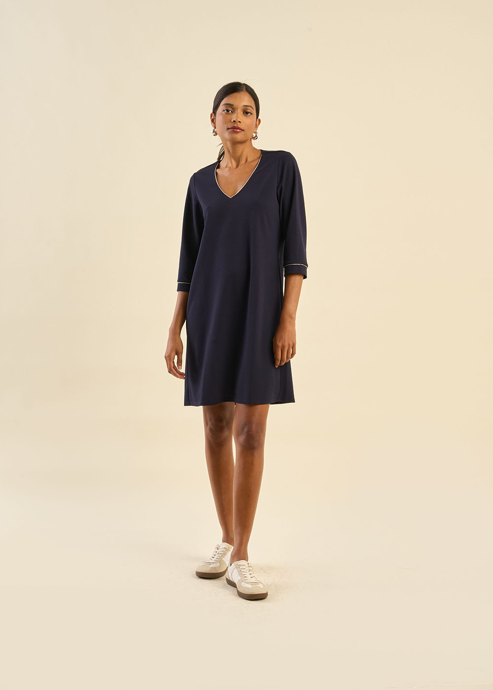 La robe RILANO allie simplicité et élégance avec sa coupe droite légèrement évasée, idéale pour une allure intemporelle et moderne. Son encolure en V est sublimée par une délicate finition en chaînette métal argentée, ajoutant une touche raffinée. Les manches trois-quarts complètent son design minimaliste et chic.