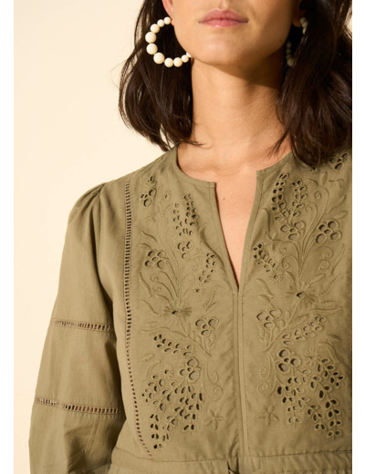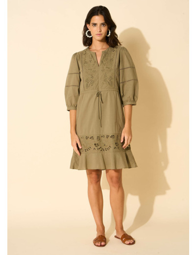 La robe courte ROMILDA présente un col tunisien et un lien de serrage à la taille offrant une silhouette ajustée et flatteuse. Son plastron avant est orné de broderie anglaise avec des détails tandis que le bas de la jupe est également agrémenté de cette broderie ajoutant une touche de sophistication.