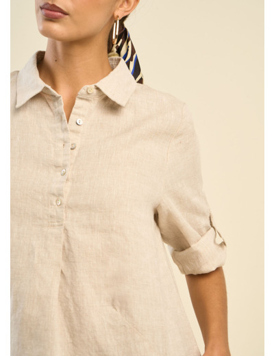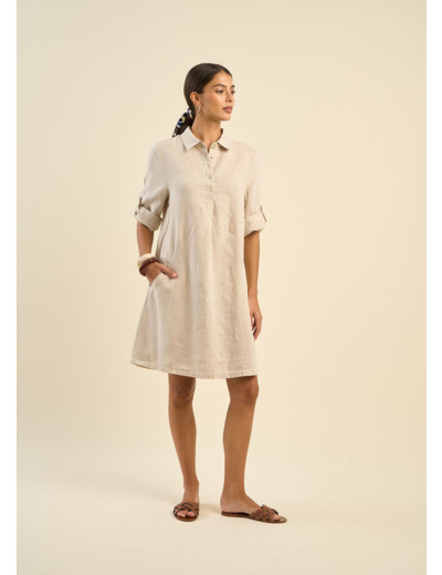 La robe courte RACYBA confectionnée entièrement en lin présente une silhouette tendance avec son col chemise classique et son pied de col. Sa patte de boutonnage à cinq boutons et ses manches longues avec patte pour faire un revers apportent une touche moderne et polyvalente à cette pièce féminine et estivale.