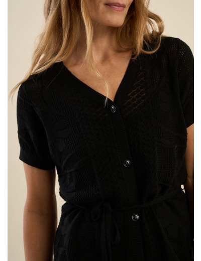 La robe RERLIE en maille ajourée est la parfaite alliance entre légèreté et féminité. Son col V flatteur et ses manches courtes apportent une touche de simplicité élégante, tandis que sa ceinture souligne délicatement la taille pour une silhouette harmonieuse. Boutonnée droit au milieu, elle se distingue par son côté à la fois chic et décontracté. Le fond de robe, avec ses bretelles réglables, assure un confort optimal. À porter avec des sandales ou des baskets pour un look moderne et raffiné.