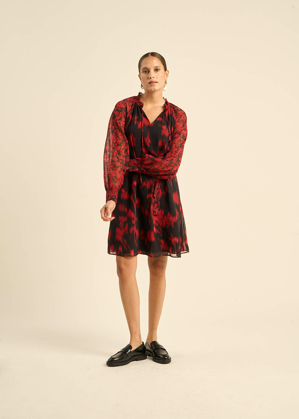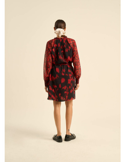 La robe RICAELA est une robe élégante et féminine avec un motif audacieux. Confectionnée dans une matière légère et fluide, elle se distingue par son design raffiné et ses détails soignés. Le col froncé en V ajoute une touche de sophistication, tandis que les manches longues bouffantes resserrées aux poignets apportent une note de romantisme. La ceinture à la taille permet de resserrer la robe, soulignant ainsi la silhouette avec élégance. Le motif floral rouge et noir apporte une note de charme et d'audace, parfaite pour des occasions spéciales ou des sorties chics.