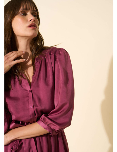 La robe courte RISLOU offre une élégance décontractée avec son col tunisien et sa patte de boutonnage. Les manches 3/4 présentent des fronces délicates en tête et en bas accentuées par un poignet classique à un bouton et une fente subtile. La taille élastiquée accompagnée d'une ceinture amovible offre un ajustement confortable et personnalisé. Les empiècements épaules et dos ornés de fronces ajoutent une touche de féminité. Une pièce polyvalente parfaite pour allier style et confort en toute simplicité.