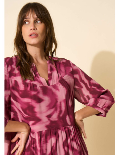 La robe courte RAMIRA présente un imprimé féminin sur toute la robe, créant un look vibrant et estival. Sa silhouette droite offre une allure moderne et élégante, tandis que les détails de volants et de manches bouffantes 3/4 ajoutent une touche de féminité et de dynamisme. Avec son col tunisien et son léger décolleté en V, elle marie habilement un style confortable et féminin.