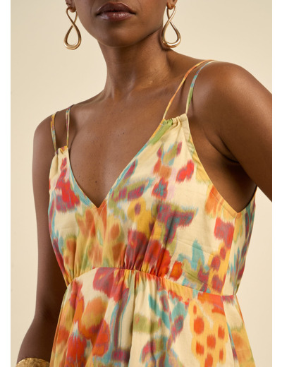 La robe Raloza est une pièce estivale et élégante, idéale pour les journées ensoleillées. Dotée de fines bretelles réglables, elle présente un décolleté en V flatteur et une coupe évasée qui apporte légèreté et fluidité. Sa matière imprimée, ornée de motifs floraux vibrants dans des tons chauds, ajoute une touche de fraîcheur et de féminité. Parfaite pour une promenade en bord de mer ou un dîner en plein air, cette robe se porte aussi bien avec des sandales que des espadrilles pour un look décontracté et chic.