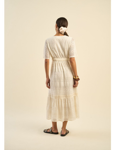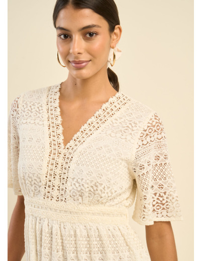 La robe RASOPHIA incarne parfaitement l’élégance bohème avec sa dentelle délicate et sa coupe fluide. Son col V flatteur et ses manches courtes papillon apportent une touche de légèreté et de romantisme. Sa silhouette évasée sublime chaque mouvement, offrant à la fois confort et féminité. Doublée en voile de coton, elle assure une sensation douce et agréable sur la peau. Idéale pour une allure à la fois chic et naturelle, elle se porte aussi bien avec des sandales que des bottines pour un style bohème affirmé.