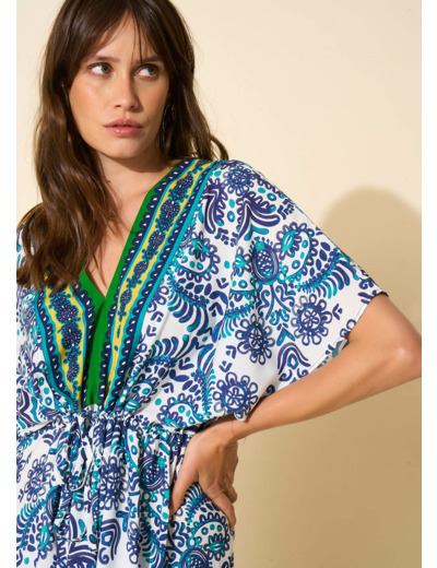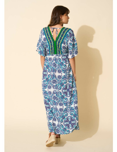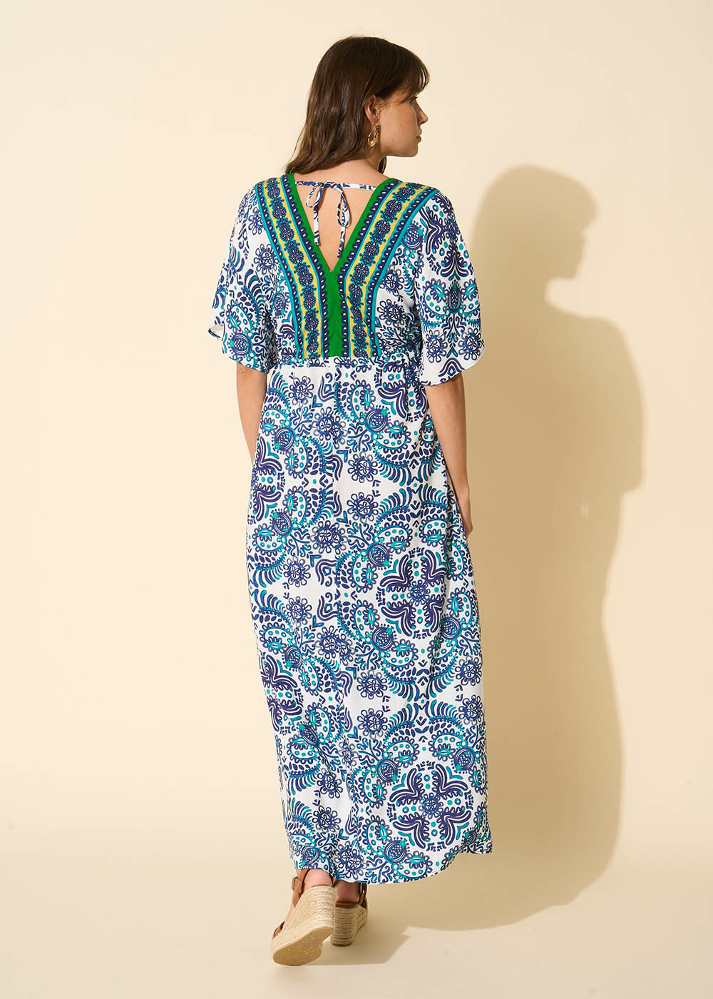 La robe longue REXACO se démarque par son décolleté à la fois devant et dans le dos. Elle est agrémentée d'un motif estival et présente un col en V, des manches courtes, ainsi qu'une délicate frise ornant le décolleté. Pour compléter votre tenue, optez pour une paire de sandales dorées.