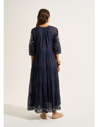 La robe ROBANA conjugue allure bohème et légèreté estivale. Confectionnée en gaze de coton, elle séduit par ses broderies contrastées et son volume aérien.