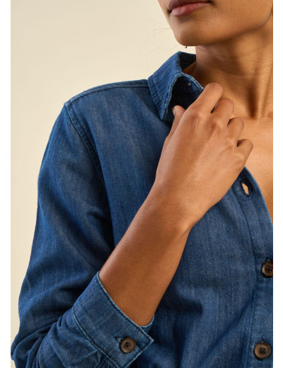 La robe mi-longue en jean RAZKALA se distingue par son col chemise classique et sa taille marquée, mettant en valeur la silhouette. Elle est également dotée de pinces poitrine pour une coupe structurée, ainsi que de poches plaquées à l'avant qui ajoutent une touche pratique et tendance.