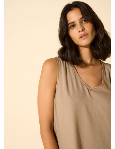 La robe RIMITI se caractérise par sa coupe midi, légèrement plus courte sur les côtés. Elle arbore un col en V et est dépourvue de manches, avec un fond de robe à bretelles intégré. Complétez votre tenue en l'associant à une paire de sandales dorées.