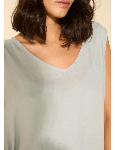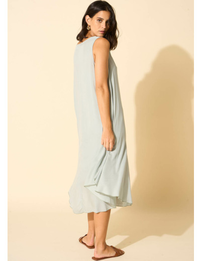 La robe RIMITI se caractérise par sa coupe midi, légèrement plus courte sur les côtés. Elle arbore un col en V et est dépourvue de manches, avec un fond de robe à bretelles intégré. Complétez votre tenue en l'associant à une paire de sandales dorées.