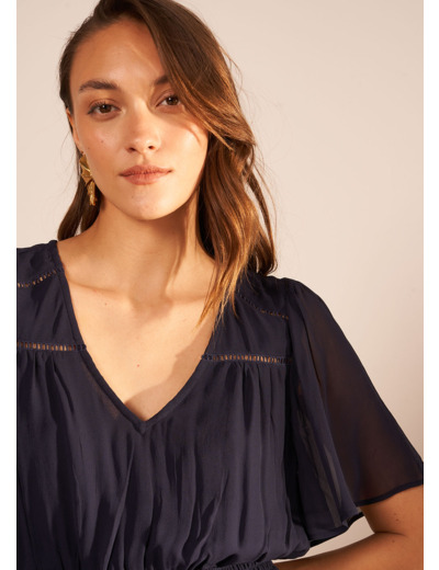 La robe midi ROSISKA est pourvue d'une taille smokée élastiquée qui saura vous mettre en valeur. Elle est pourvue de manches courtes et d'un col V. Complétez votre look en l'associant à une paire de bottes en daim.