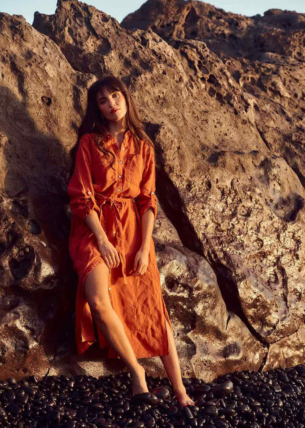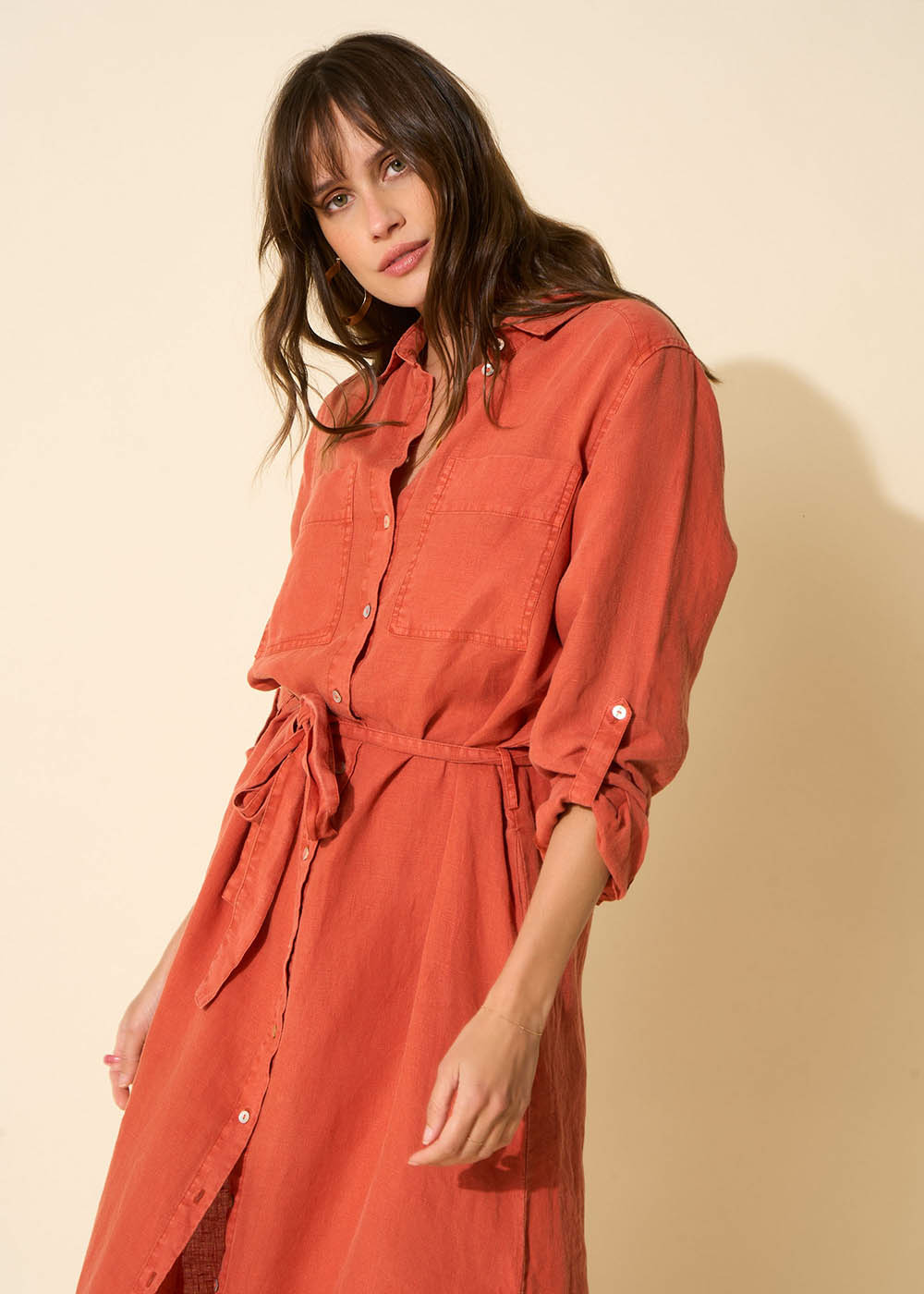 La robe midi ROSKALI confectionnée entièrement en lin offre une silhouette chemise décontractée idéale pour ce printemps été. Ses manches longues sont agrémentées de poignets classiques à deux boutons. Une patte de revers ornée d'un bouton et des poches plaquées à l'avant ajoutent des détails raffinés à la pièce. La ceinture amovible permet une personnalisation du look tandis que les fentes en bas de jupe lui apportent une touche moderne.