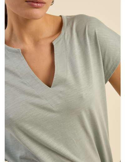 Le t-shirt TERA allie confort et style avec son col tunisien agrémenté d'une surpiqûre en V, apportant une touche moderne et raffinée. Ses manches courtes et son épaule tombante lui confèrent une coupe décontractée et élégante. Ce modèle simple et intemporel se porte aisément avec un jean ou un pantalon léger pour un look à la fois tendance et confortable.