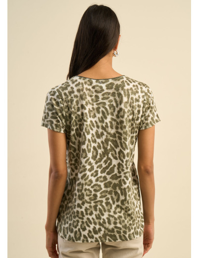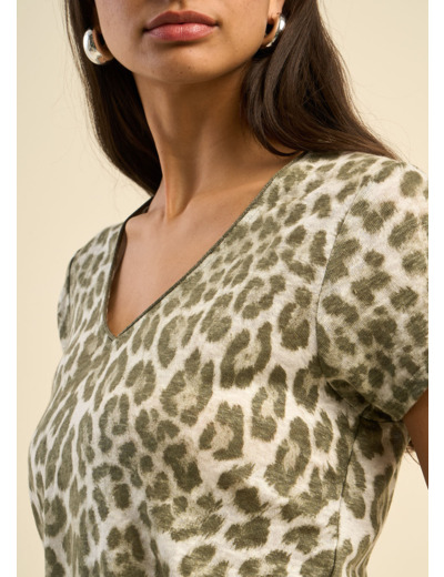 Le t-shirt TAJA allie audace et féminité avec son imprimé léopard revisité dans une teinte subtile et moderne. Confectionné en lin, il offre une légèreté et un confort incomparables, parfaits pour une allure décontractée et élégante. Son col V flatteur met en valeur le port de tête, tandis que ses manches courtes assurent une silhouette fluide et aérienne. La finition roulottée en lurex ton sur ton à l’encolure ajoute une touche de brillance discrète, idéale pour illuminer vos tenues du quotidien.