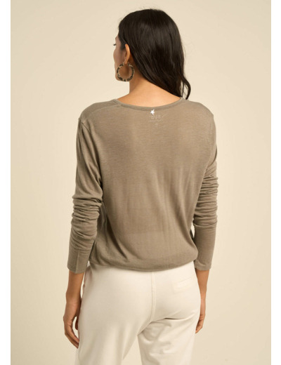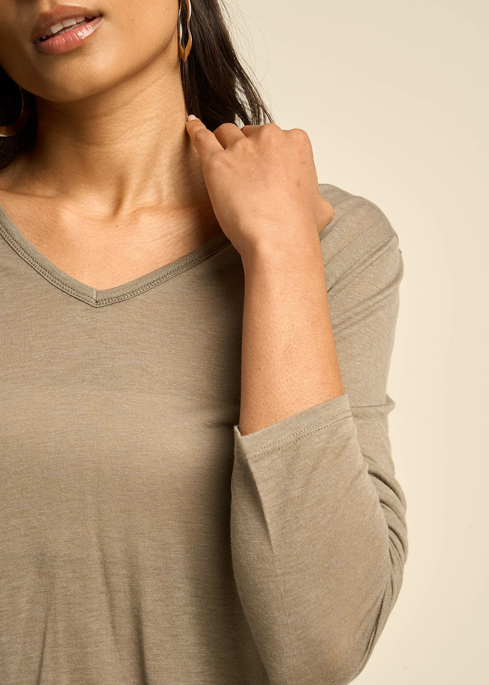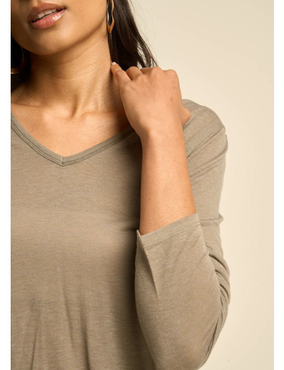 Découvrez notre T-shirt TASSINA en voile de laine, doté d'un col V élégant et de manches 3/4. Cette pièce légère et raffinée allie confort et style, parfaite pour un look chic et décontracté. Adoptez ce T-shirt pour une allure sophistiquée en toute simplicité. Il existe en 5 coloris.