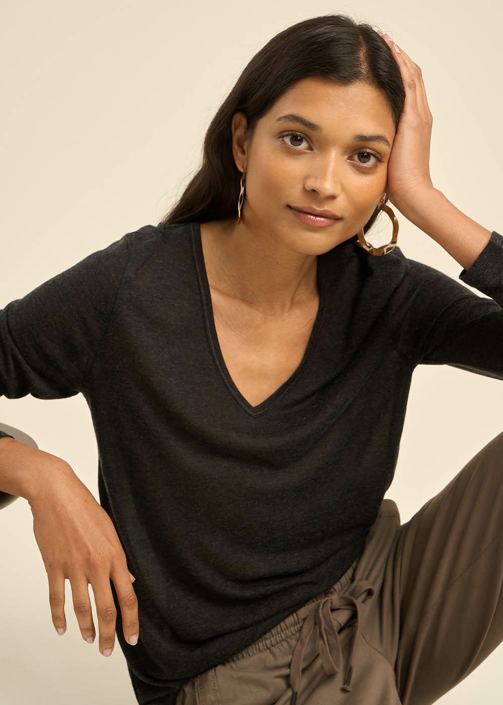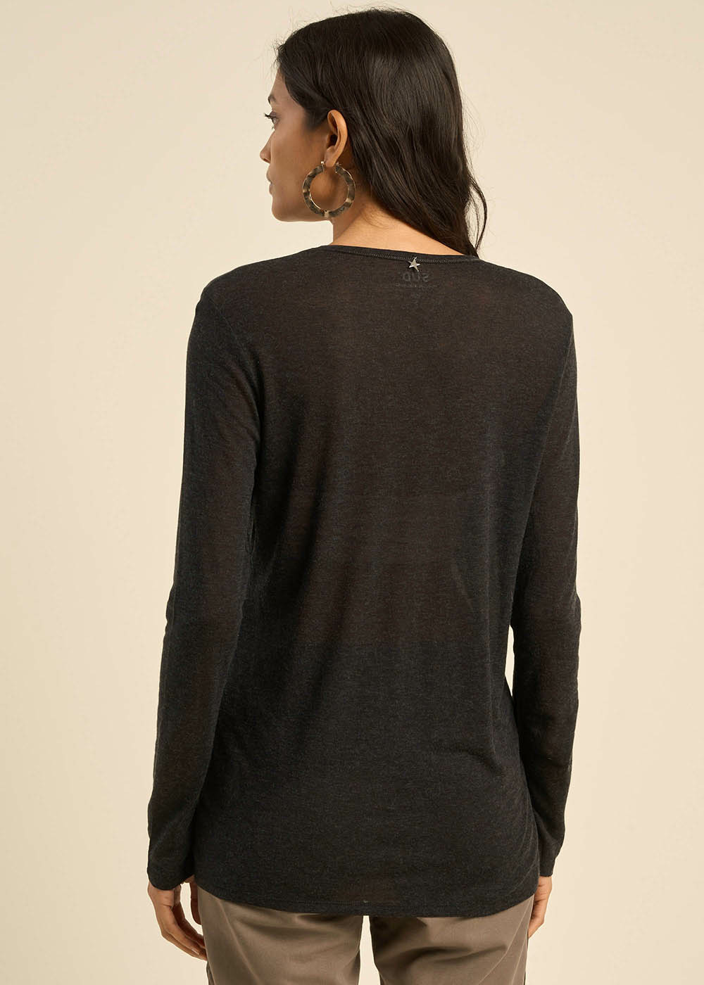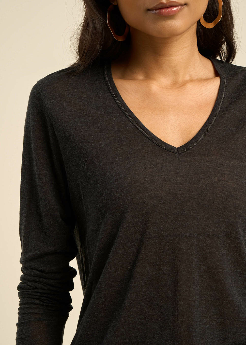 Tee-shirt col V et manches 3/4 en voile de laine