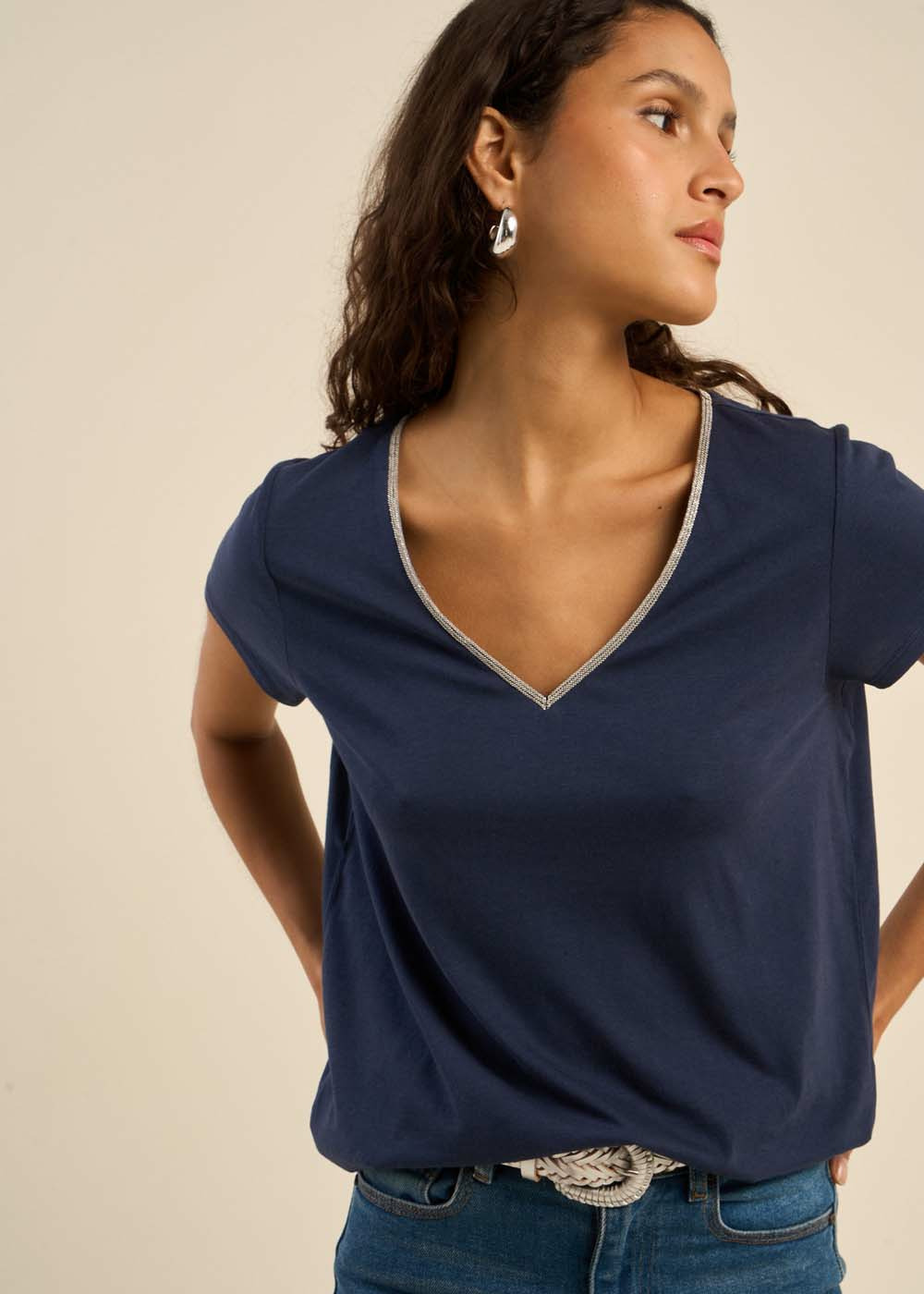 Facile à associer avec un jean ou un pantalon le tee-shirt TOANY est un indispensable dans votre dressing. Focus sur son col en V aux détails métalliques qui lui donne une allure chic et décontractée.