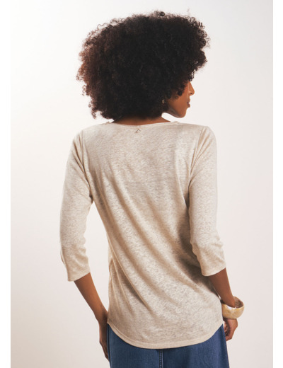 Le tee-shirt TOMEOH redéfinit le classique avec ses manches 3/4 en 100% lin. Il allie simplicité et sophistication avec un col en V flatteur et un détail subtil : un fil lurex qui apporte une touche d'éclat à l'encolure. Polyvalent et raffiné TOMEOH se porte aussi bien avec un tailleur qu'avec un jean.