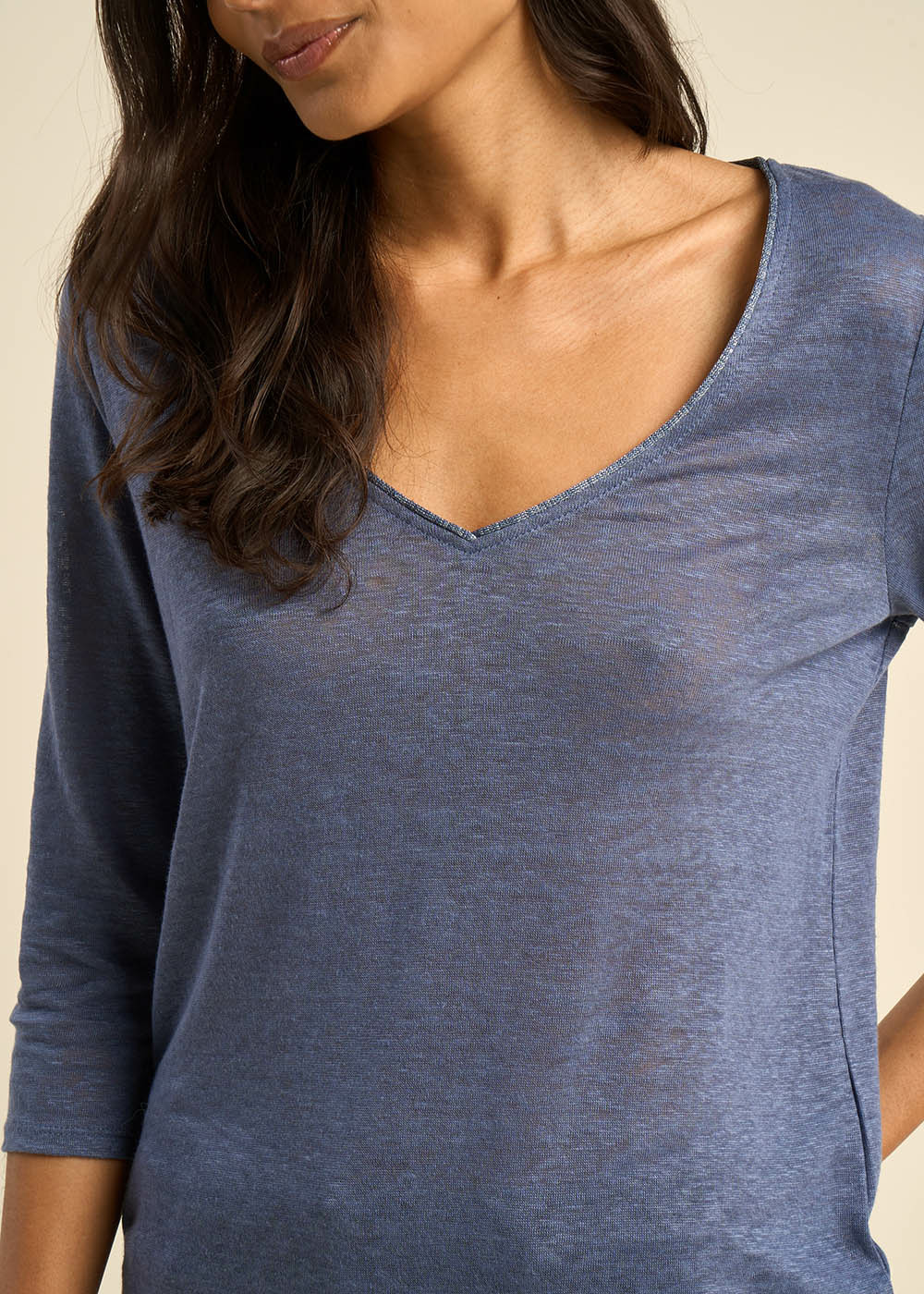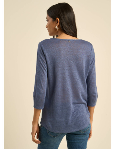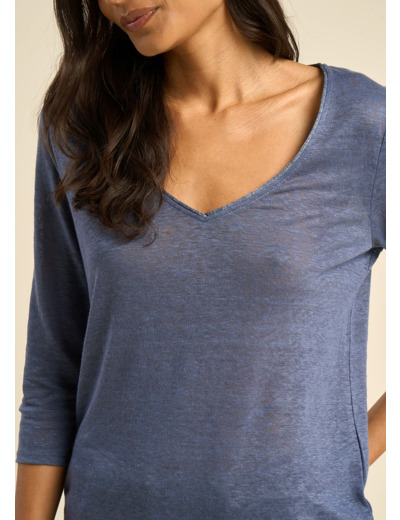 Le tee-shirt TOMEOH redéfinit le classique avec ses manches 3/4 en 100% lin. Il allie simplicité et sophistication avec un col en V flatteur et un détail subtil : un fil lurex qui apporte une touche d'éclat à l'encolure. Polyvalent et raffiné TOMEOH se porte aussi bien avec un tailleur qu'avec un jean.
