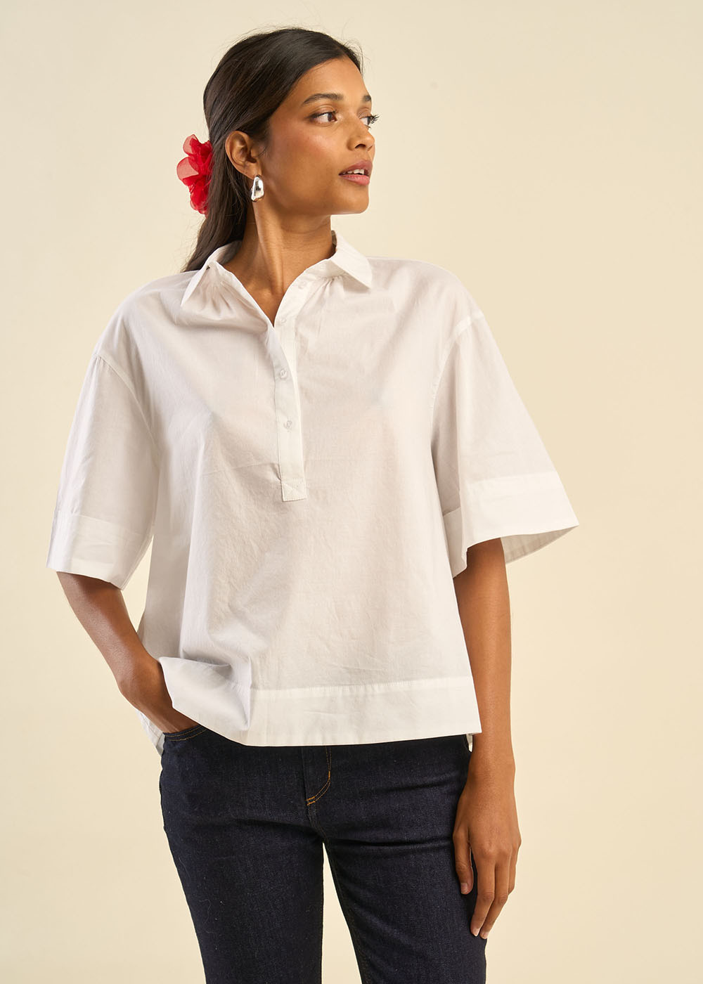 Le top CHELSIA allie confort et style avec son col polo délicatement froncé, apportant une touche originale et élégante. Confectionné en 100% coton, il offre une sensation de douceur tout au long de la journée. Ses manches courtes avec gros revers et sa coupe ample en font une pièce légère et fluide. Le détail des fronces au niveau du pied de col ajoute une note subtile et féminine. Il se porte facilement avec un jean pour un look à la fois simple et élégant.